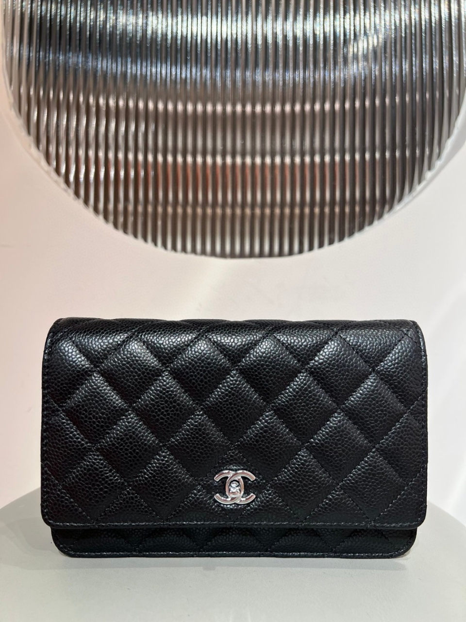 샤넬 클래식 라인을 기반으로 한 WOC(체인 월렛) 모델로 다이아몬드 퀼팅과 CC 턴락 장식, 체인 스트랩이 특징인 아이코닉 디자인입니다. 슬림한 실루엣과 실용적인 내부 수납으로 데일리 크로스백으로 활용하기 좋은 모델입니다.