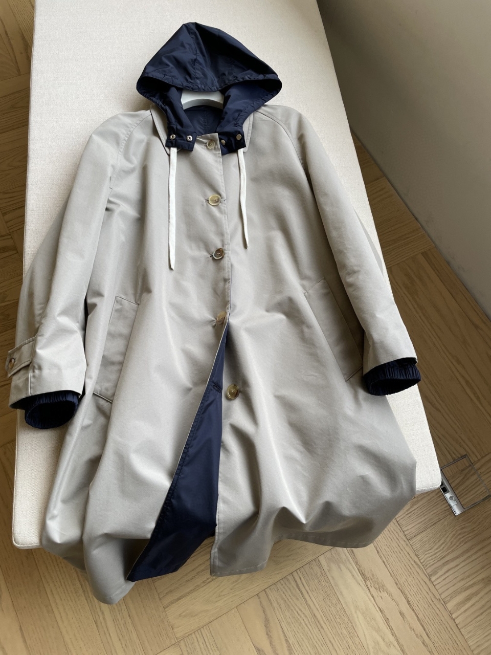 미우미우 리버시블 코튼 블렌드 트렌치 코트양면으로 착용 가능한미우미우 감성의 하이엔드 트렌치 코트.단순한 합포 방식이 아닌이중 원단 독립 제작으로착용 시 자연스러운 볼륨감과 구조적인 실루엣을 완성합니다.한쪽은 고급 코튼 블렌드 소재로부드러운 촉감과 은은한 광택감이 돋보이며깔끔하고 클래식한 무드를 연출합니다.반대쪽은 나일론 블렌드 소재로가볍고 내구성이 뛰어나캐주얼하면서도 실용적인 스타일링이 가능합니다.후드 디테일과 버튼 클로징 구조로데일리부터 여행, 출퇴근까지다양한 상황에서 활용 가능한 멀티 아우터.가벼우면서도 형태를 잘 잡아주는 소재감으로착용 시 자연스럽게 떨어지는 핏이 특징입니다.사이즈S / M / L