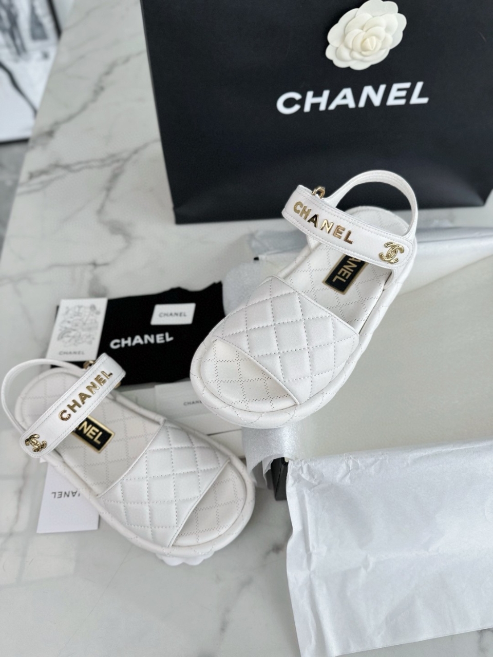 샤넬 시그니처 퀼팅 패턴과 편안한 벨크로 스트랩 디자인이 돋보이는 24C 시즌 샌들입니다. 가볍고 안정적인 착용감으로 데일리룩부터 여행룩까지 편안하면서도 고급스럽게 매치하기 좋은 모델입니다.