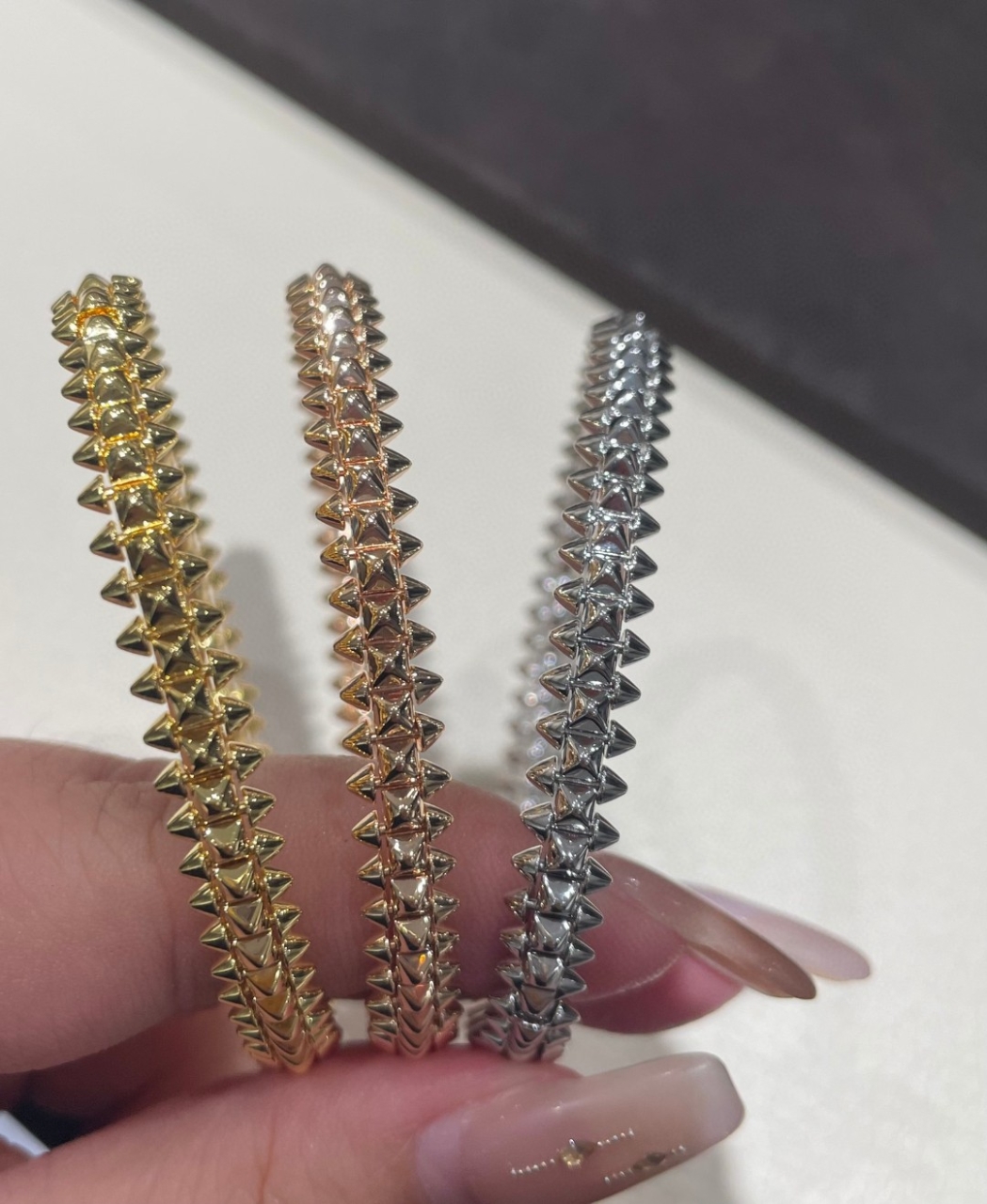 CARTIER 까르띠에 스터드 브레이슬릿세련된 스터드 디테일이 돋보이는모던한 감성의 까르띠에 스타일 브레이슬릿입니다.촘촘하게 배열된 입체적인 스터드 디자인이손목 위에서 강렬하면서도 세련된 분위기를 연출합니다.슬림하면서도 존재감 있는 라인으로단독 착용은 물론 다양한 팔찌와의레이어드 스타일링에도 잘 어울립니다.정교한 마감과 깔끔한 구조로고급스러운 분위기를 완성하며데일리 스타일에 포인트가 되는 아이템입니다.심플하면서도 개성 있는 디자인으로캐주얼부터 포멀한 스타일링까지다양하게 매치 가능한 프리미엄 주얼리입니다.