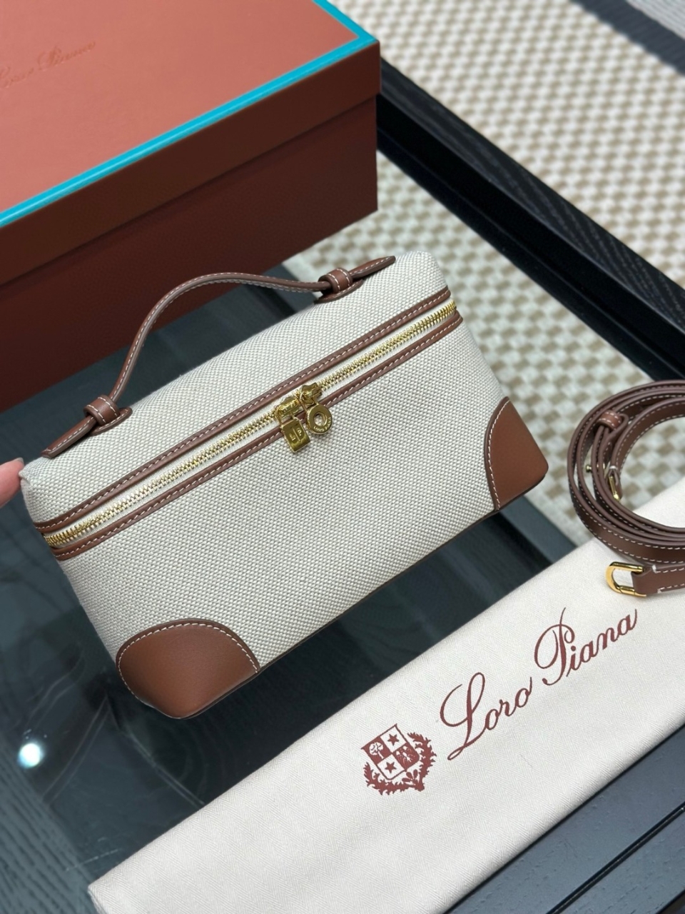 로로피아나 특유의 미니멀한 감성이 돋보이는 클래식 엑스트라 포켓 디자인 미니백입니다. 가볍고 실용적인 사이즈로 데일리, 여행, 외출용으로 편하게 착용하기 좋으며 차분한 컬러 조합이 고급스러운 분위기를 완성합니다.
