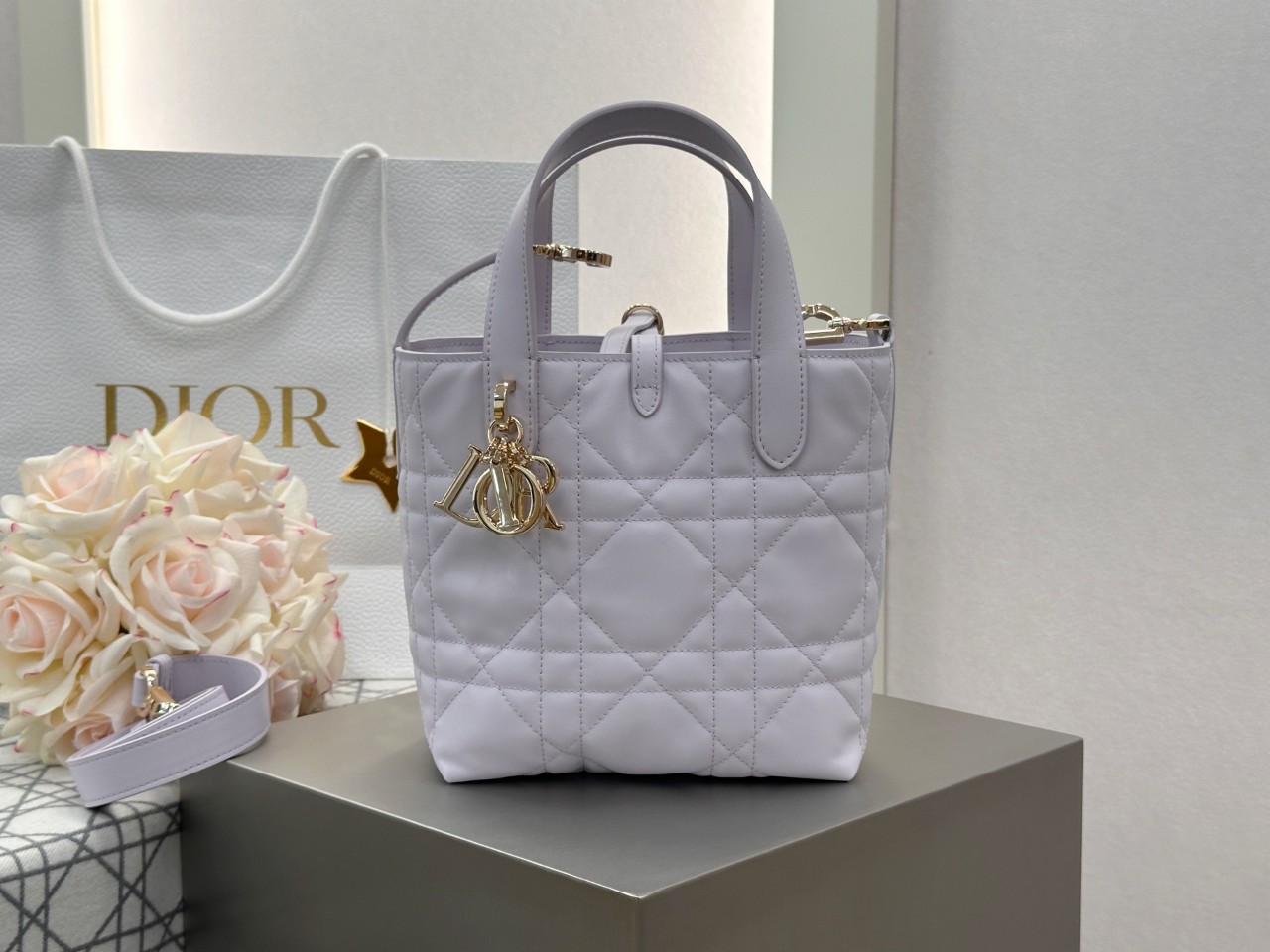 부드러운 라이트 퍼플 송아지 가죽과 디올의 아이코닉 퀼팅 패턴이 어우러져