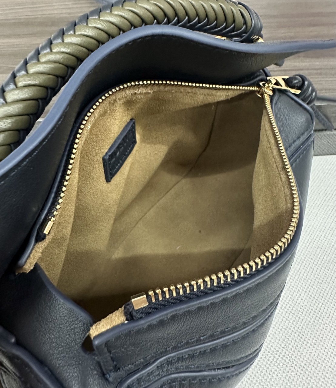 ◼ 상단 지퍼 클로저 + 브레이드 디테일 핸들 + 골드 톤 하드웨어 포인트