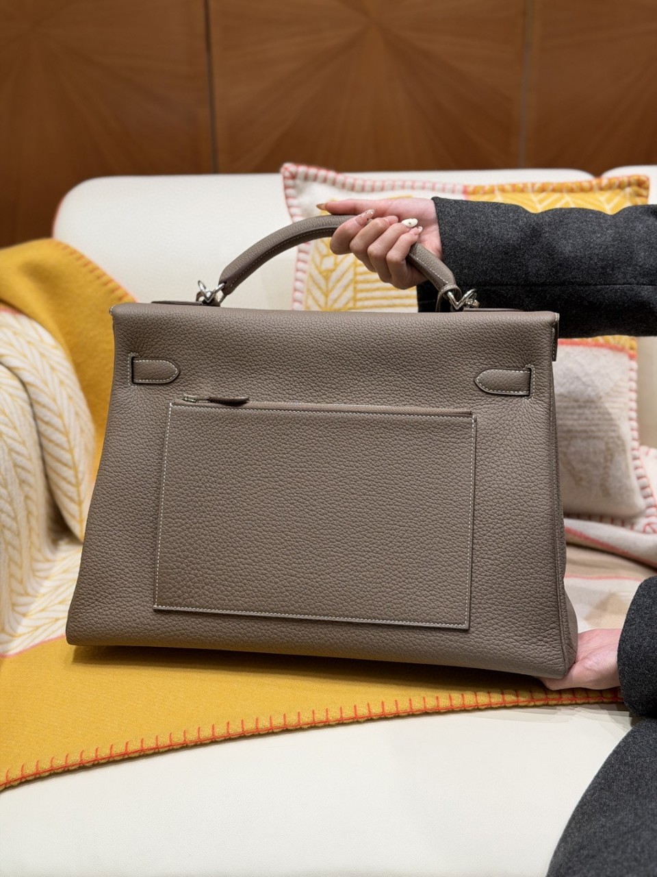 에르메스 라인 중에서도 수납력과 존재감이 최상급인 켈리 맥시 42 입니다. 에토프(Etoupe) 컬러는 브라운과 그레이가 섞인 고급 중성톤으로 어떤 스타일에도 자연스럽게 어울리면서 에르메스 특유의 “우아한 무드”를 가장 잘 보여주는 컬러입니다.