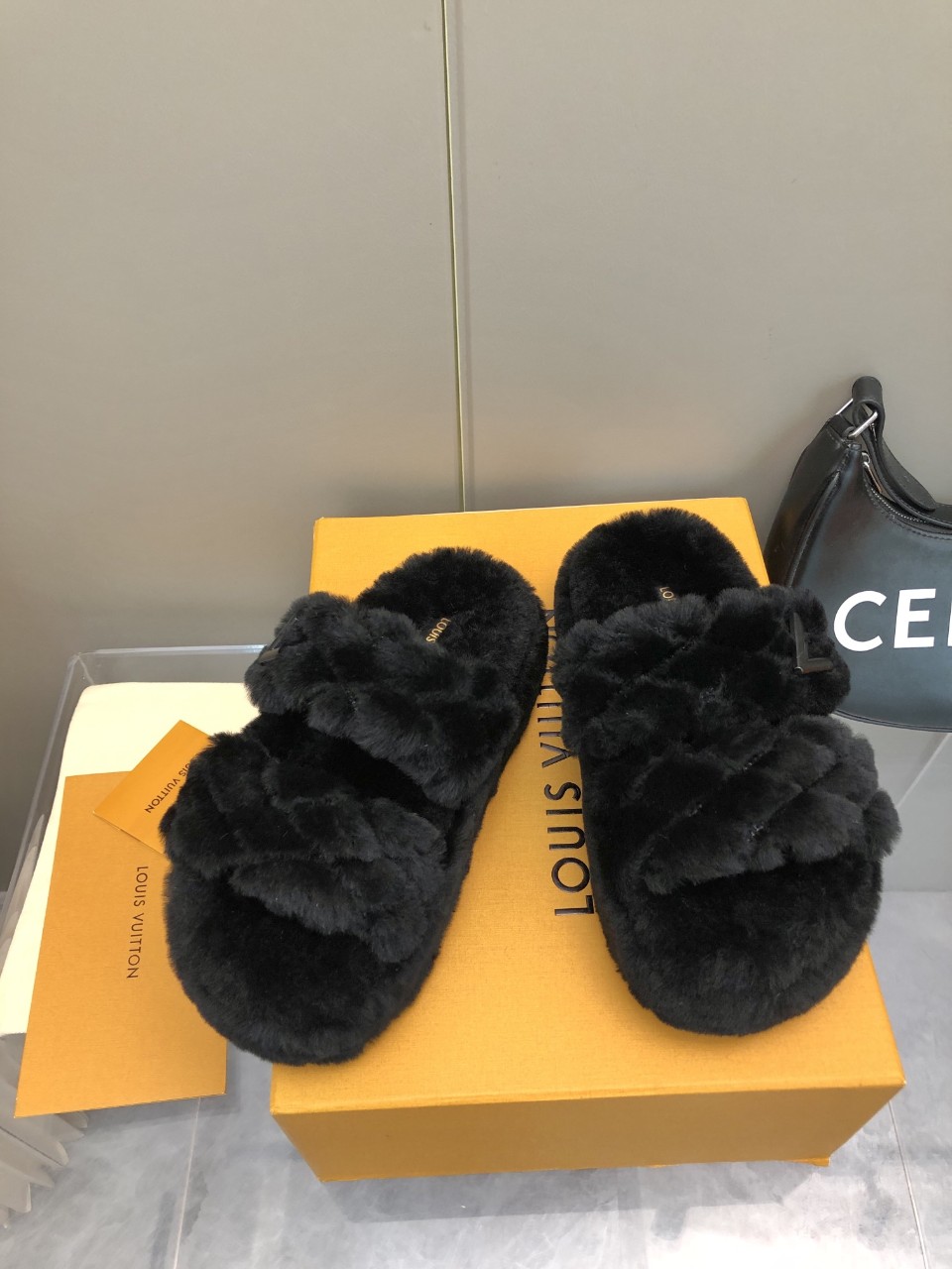 깊이 있는 블랙 퍼 소재로 완성된 루이비통 겨울 시즌 퍼 슬리퍼.