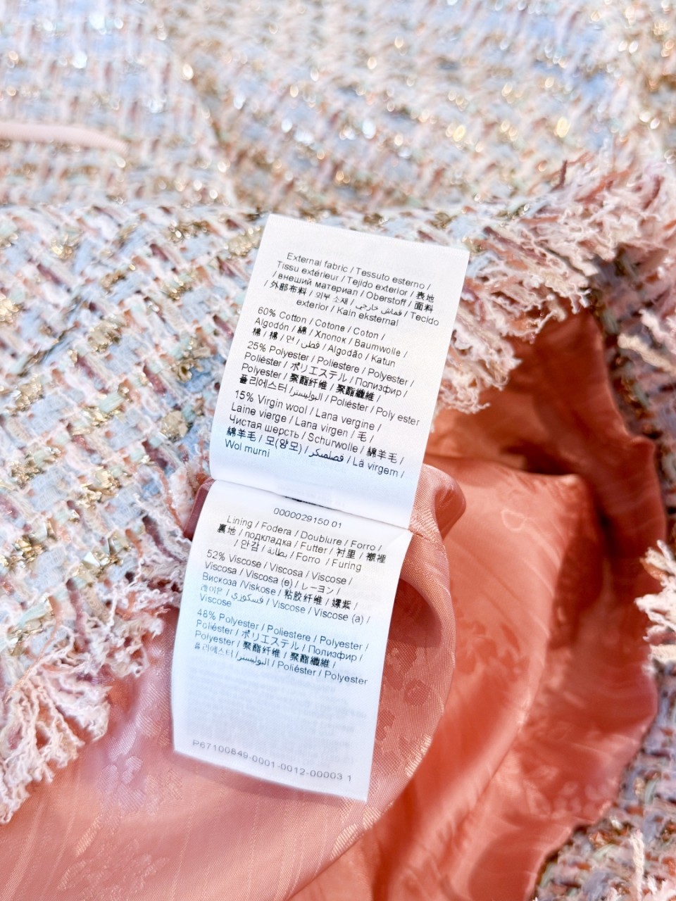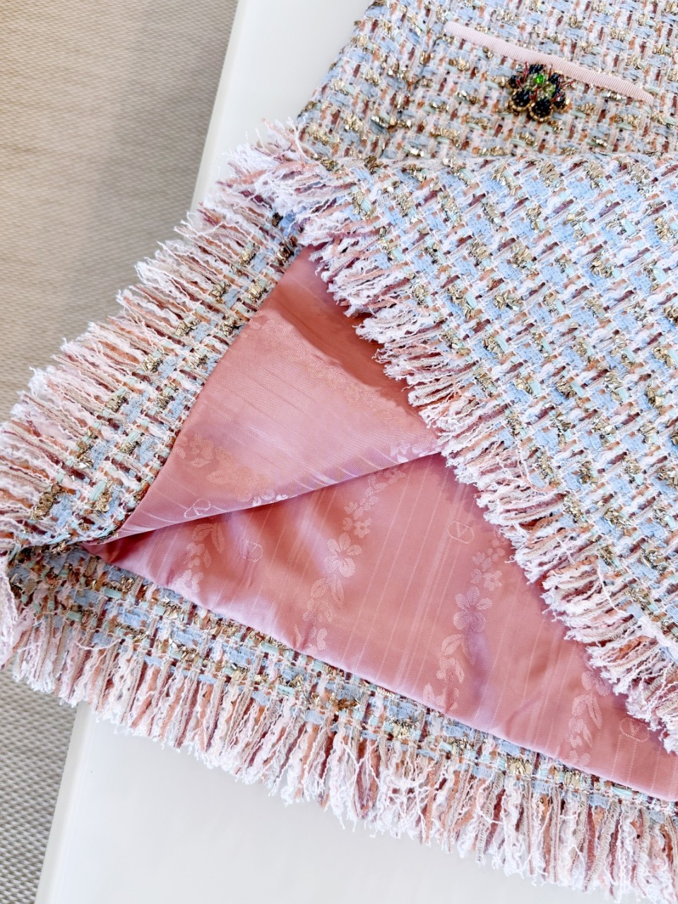 핑크톤 트위드에 스팽글 자수가 은은한 반짝임을 더해주며, 고급스럽고 로맨틱한 무드를 연출합니다.