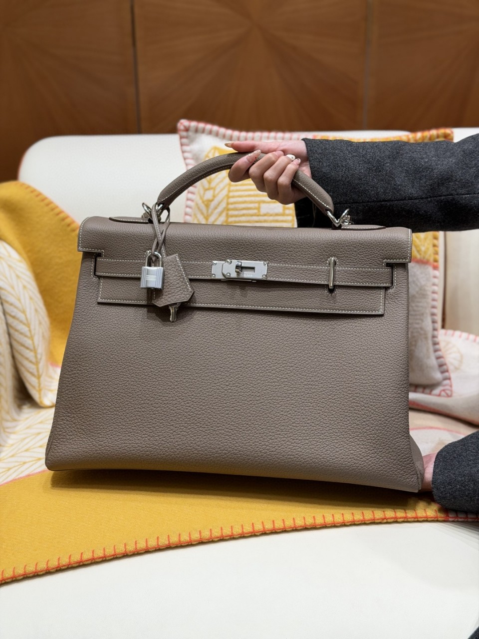 에르메스 켈리 맥시 42 에토프 토고 실버Hermès Kelly Maxi 42 EtoupeTogo Leather / Silver Hardware고객 주문 제작 상품에르메스 라인 중에서도수납력과 존재감이 최상급인 켈리 맥시 42 입니다.에토프(Etoupe) 컬러는브라운과 그레이가 섞인 고급 중성톤으로어떤 스타일에도 자연스럽게 어울리면서에르메스 특유의 “우아한 무드”를 가장 잘 보여주는 컬러입니다.토고(Togo) 가죽 특유의 입체적인 결감과 내구성 덕분에큰 사이즈에서도 쉐입이 탄탄하게 잡히고시간이 지나도 멋이 깊어지는 프리미엄 조합입니다.✔ 맥시 사이즈의 압도적 수납력✔ 토고 가죽 결감 + 탄탄한 형태 유지✔ 실버 하드웨어로 세련된 분위기✔ 디테일(각인/스티치/하드웨어) 완성도 우수✔ 소장가치 최상급 클래식 라인---제품 포인트제품명: 에르메스 켈리 맥시 42컬러: 18 Etoupe (에토프)가죽: Togo (프랑스 수입 토고 가죽)하드웨어: 실버제작: 고급 풀수작업 제작특징: 대용량 수납 / 견고한 쉐입 / 프리미엄 마감---사이즈42 × 28 × 16 cm---판매가문의 (만원 단위 안내)---켈리 맥시 42 에토프는클래식하면서도 분위기가 압도적인 조합이라한 번 들면 “격이 다르다”가 바로 느껴지는 제품입니다?---