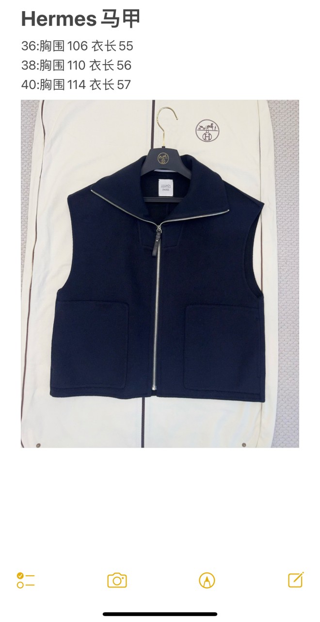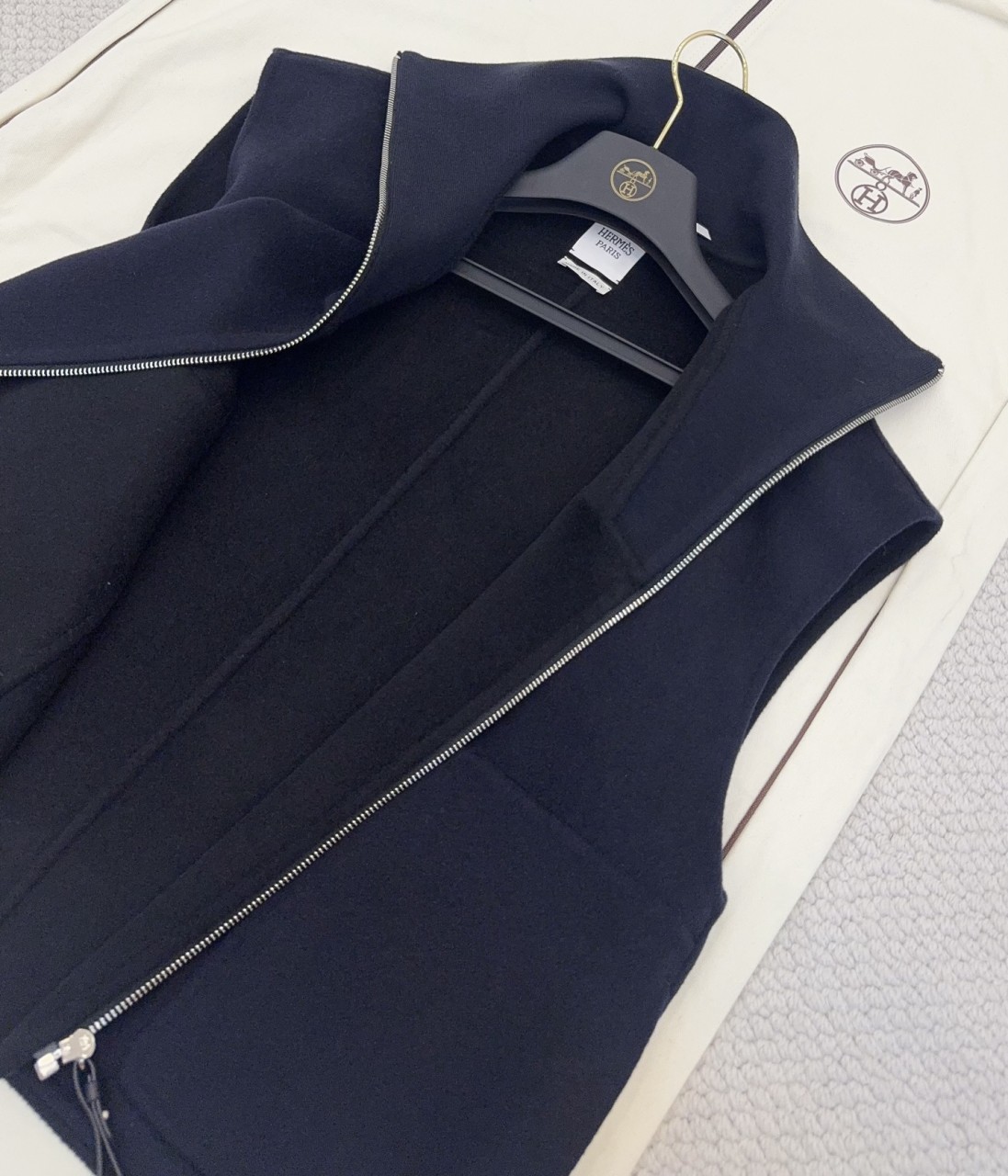 Hermes 2025 F/W 캐시미어 울 베스트 — 맞춤 캐시미어 울 혼방으로 완성된 세련된 집업 스타일의 실용적인 베스트.