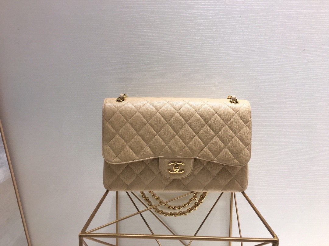지존샵 CHANEL Classic Flap Bag Jumbo 30cm(샤넬 클래식 플랩백 점보)샤넬을 대표하는 아이코닉 클래식 라인으로다이아몬드 퀼팅과 CC 턴락 장식이 특징인 모델입니다.소재Grained Calfskin (캐비어 가죽)하드웨어Gold-Tone Metal사이즈약 30 × 20 × 10 cm