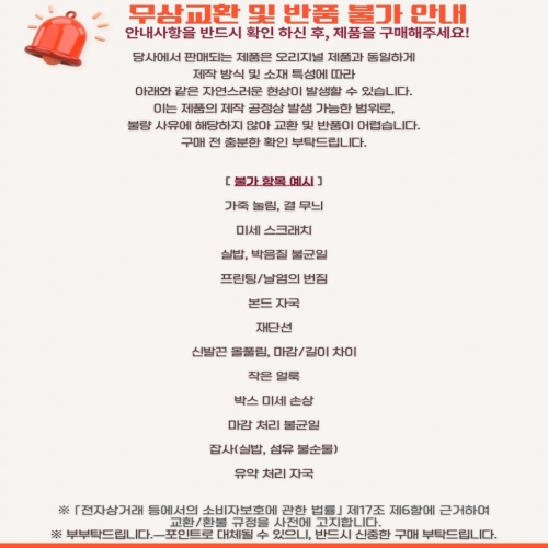 🔄 교환/환불 안내 주문전 공지사항 필독 !!!!! 모든 상품은 수입 제품으로 단순 변심 사유로 교환/환불이 불가합니다. 보낸대로 제품과 다를 경우(상품 사용흔적, 손상, 세탁 등)는 교환/환불 절대 불가합니다. 불량으로 인한 교환/환불은 동일 제품으로만 진행 가능하며, 왕복 배송비는 고객님 부담입니다. 상세페이지와 상이한 문제가 있을 시 24시간 내 카카오톡으로 문의 부탁드립니다. 📌 무상 교환 및 반품 불가 안내 "더미러"에서 판매되는 제품은 오리지널(ZP) 제품과 동일하게 기계/제작 특성상 아래와 같은 현상이 발생할 수 있으며, 이 경우 교환 및 반품이 불가하오니 구매 전 참고 부탁드립니다. [불가 항목 예시] 가죽 본드 자국 미세 스크래치 금속 메탈의 변색 본드자국/눌림 프린트 마감 불균일 실밥 미세 잔여물 미세한 눌림/찍힘 박음질 어긋남 가죽 특유의 주름 및 결 ※ 『전자상거래 등에서의 소비자보호에 관한 법률』 제17조 제2항에 근거하여 교환/환불 규정을 제정하고 있음을 안내드립니다. ※ 부득이한 경우 동일 모델로 대체될 수 있으며, 반드시 신청 후 교환/환불 진행됩니다.