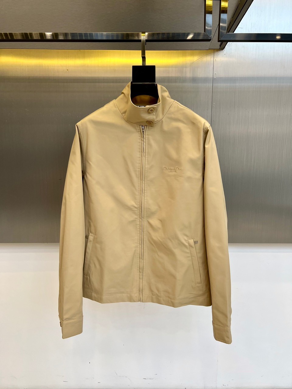 왼쪽 가슴의 Dior 로고 자수 디테일, 동일 톤으로 은은하게 표현되어 브랜드 정체감 강조