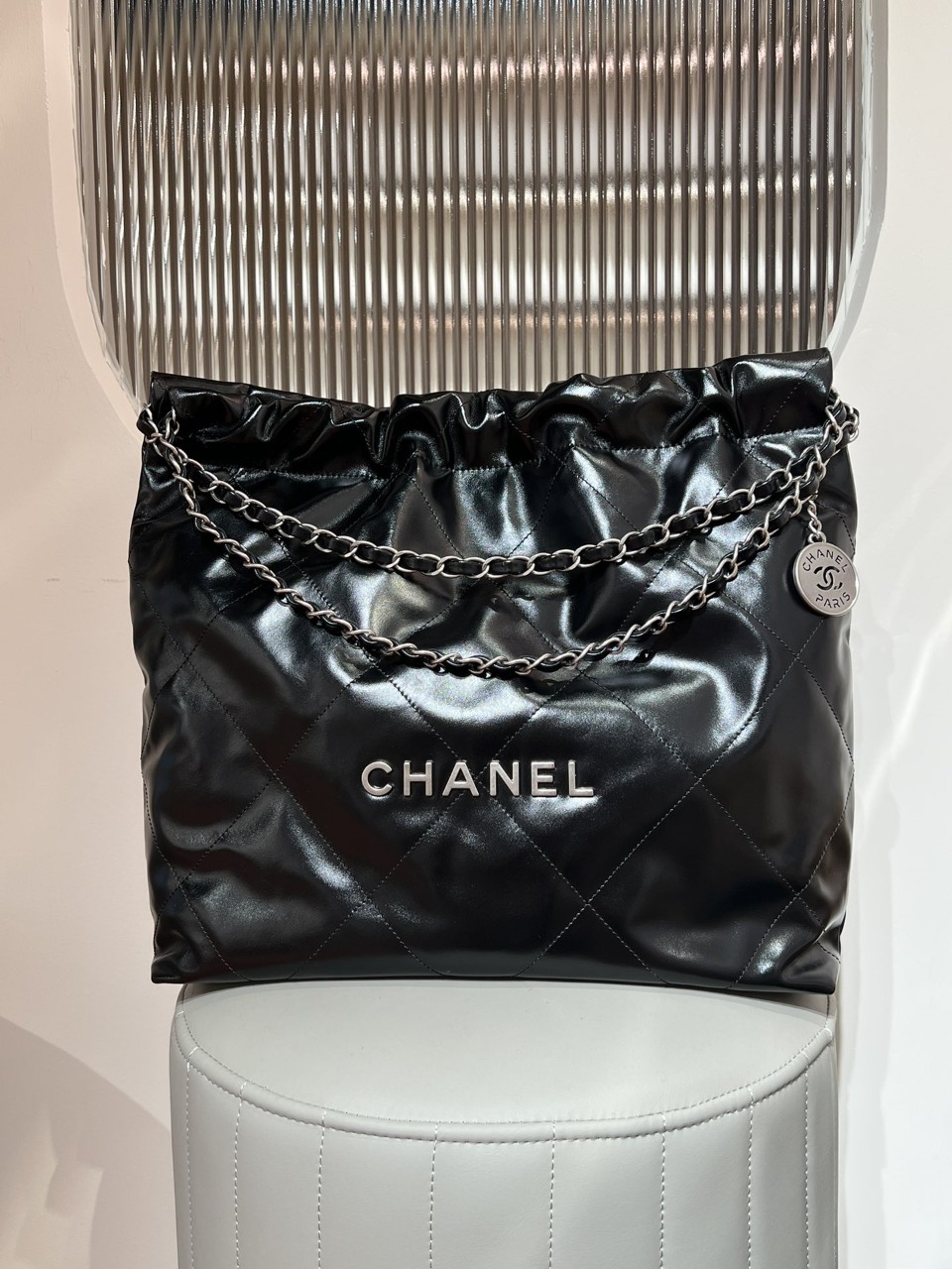 (지존샵) 샤넬 22 백 미디엄 카프스킨 (실버 하드웨어)부드럽게 흐르는 실루엣과 퀼팅 디테일이 특징인 샤넬 22 백 미디엄 모델입니다.전면 CHANEL 레터링 로고와 체인 스트랩, 체인 참 디테일이 어우러져캐주얼하면서도 브랜드 아이덴티티가 분명한 디자인입니다.---✔ 제품 정보제품명: 샤넬 22 백 카프스킨 (미디엄)사이즈: 가로 39cm × 세로 42cm × 폭 8cm소재: 카프스킨(소가죽)컬러: 블랙하드웨어: 실버 톤 메탈디자인 특징:소프트한 쉐입과 퀼팅 패턴드로우스트링 구조체인 숄더 스트랩전면 CHANEL 레터링 로고 & 체인 참 디테일---✔ 활용도넉넉한 수납의 데일리 숄더백캐주얼·세미포멀 스타일 모두 매칭블랙 컬러로 사계절 활용 가능---