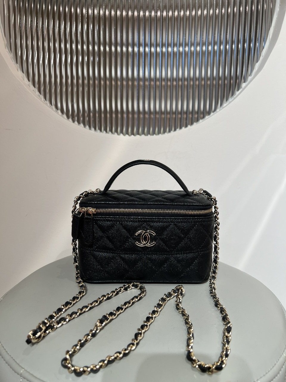 (지존샵) 샤넬 25 스몰 베니티 백 (캐비어)(CHANEL 25 Small Vanity With Chain)25C 시즌 스몰 사이즈 베니티 백으로,탑핸들과 체인 스트랩이 결합된 컴팩트한 박스 실루엣이 특징인 모델입니다.클래식 퀼팅과 전면 CC 로고가 균형감 있게 배치되어, 미니 사이즈임에도 존재감이 확실합니다.본 제품은 지존공장 제작 기준으로 마감과 디테일 완성도를 높였습니다.---✔ 제품 정보공식 제품명: CHANEL 25 Small 사이즈: 가로 18cm × 세로 9.5cm × 폭 8cm소재: 그레인드 카프스킨 (Grained Calfskin / 캐비어)입자감이 살아 있는 표면 질감으로 스크래치에 강하고 형태 유지력이 우수하드웨어: 골드 톤 메탈디자인 특징상단 지퍼 클로저탑핸들 + 체인 스트랩 구성베니티 쉐입으로 효율적인 수납 구조---✔ 지존공장 제작 포인트정확한 사이즈 비율 구현캐비어 질감의 입자감·탄탄한 가죽 밀도지퍼 라인, CC 로고, 체인 연결부 마감 정교각 무너짐 없이 안정적인 박스 실루엣 유지실사 기준 디테일 완성도 우수---✔ 활용도미니백/포인트백으로 활용숄더·크로스 연출 가능데일리부터 포멀 룩까지 폭넓은 매칭---