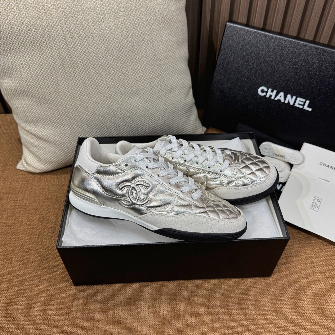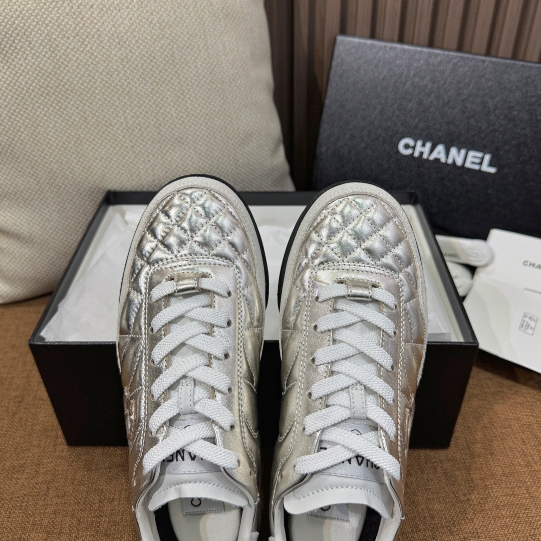 클래식한 CC 로고와 다이아 퀼팅 패턴이 조화를 이루는 샤넬 테니스 스니커즈 라인. 미니멀한 실루엣에 퀼팅 디테일을 더해 캐주얼하지만 고급스러운 분위기를 완성합니다. 데일리룩은 물론 세미 캐주얼 스타일까지 자연스럽게 매칭됩니다.