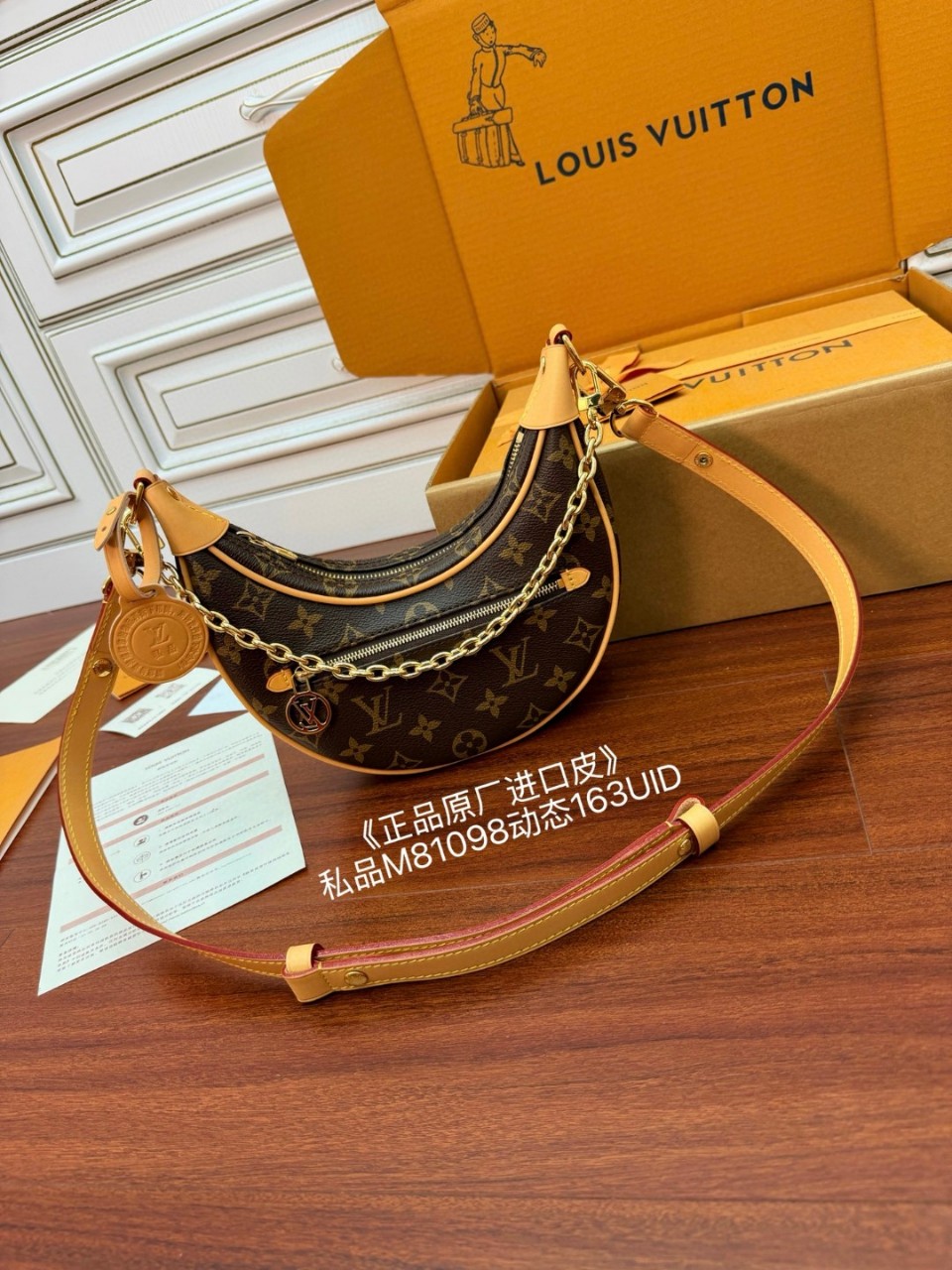 LOUIS VUITTON Loop 모노그램 캔버스 숄더백루이비통 루프 모노그램 숄더백아카이브 크루아상 실루엣에서 영감을 받은트렌디한 반달 쉐입의 Loop 백.클래식 모노그램과 현대적인 곡선 구조가 만나빈티지 무드와 세련된 감성을 동시에 담아낸 모델입니다.---DESIGN (디자인)반달형(하프문) 실루엣더블 스트랩 구성 (레더 숄더 + 체인)골드 톤 지퍼 클로징컴팩트하지만 입체적인 구조숄더 · 체인 숄더 · 크로스 3WAY 연출 가능.---MATERIAL (소재)모노그램 코팅 캔버스천연 카우하이드 가죽 트리밍골드 톤 메탈 하드웨어내부 패브릭 라이닝가볍고 내구성 높은 소재 구성으로데일리 사용에 적합합니다.---SIZE (사이즈)약 23 × 13 × 6 cm휴대폰 · 카드지갑 · 립 · 키홀더 등필수 소지품 수납 가능한 실용적인 미니 사이즈.