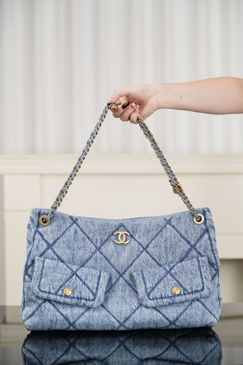 CHANEL 데님 퀼팅 호보 체인백샤넬 특유의 클래식한 디자인에캐주얼한 데님 소재가 더해진감각적인 데님 퀼팅 호보 체인백입니다.부드러운 데님 패브릭 위에샤넬 시그니처 다이아몬드 퀼팅 패턴이 더해져캐주얼하면서도 고급스러운 분위기를 동시에 연출합니다.전면에 자리한 샤넬 더블 C 로고 장식과골드 톤 체인 스트랩이 조화를 이루며데님 특유의 내추럴한 감성을 한층 더 돋보이게 합니다.---DETAIL• 감각적인 프리미엄 데님 패브릭 소재• 클래식 다이아몬드 퀼팅 패턴 디자인• 아이코닉 샤넬 더블C 로고 장식• 고급 가죽 인터레이스 체인 스트랩• 전면 플랩 포켓 수납 구조• 자연스럽게 떨어지는 호보 스타일 실루엣---STYLE가볍고 부드러운 쉐입으로데일리룩, 캐주얼룩, 여행 스타일링까지 자연스럽게 어울리는 디자인입니다.데님 소재 특유의 트렌디한 분위기와샤넬 클래식 감성이 조화를 이루어사계절 활용하기 좋은 스타일리시한 아이템입니다.---