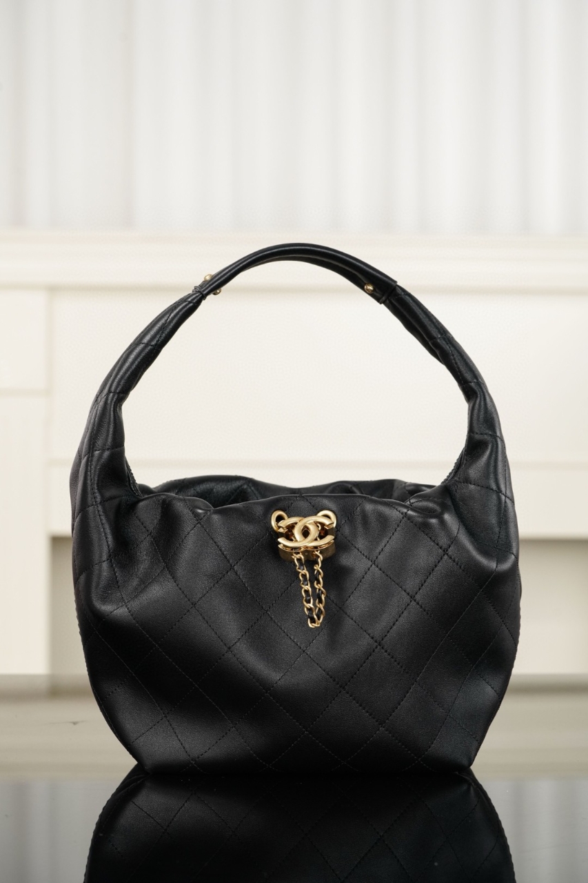 CHANEL 26C 미니 호보백 블랙 금장샤넬 26C 시즌에서 선보인세련된 실루엣의 드로우스트링 호보백입니다.자연스럽게 떨어지는 호보 실루엣과샤넬 특유의 다이아몬드 퀼팅 패턴이 조화를 이루어우아하면서도 편안한 분위기를 연출하는 모델입니다.부드러운 프리미엄 카프스킨 소재와아이코닉한 더블 C 로고 장식이 더해져고급스러운 샤넬 감성을 완성합니다.---DETAIL• 부드러운 프리미엄 카프스킨 소재• 클래식 다이아몬드 퀼팅 패턴 디자인• 아이코닉 샤넬 더블C 로고 장식• 실용적인 드로우스트링 오프닝 구조• 자연스럽게 떨어지는 호보 스타일 실루엣• 가볍고 편안한 숄더 스타일 디자인---SIZE32 × 24 × 11 cm---STYLE부드럽고 자연스러운 쉐입으로데일리룩, 캐주얼룩, 여행 스타일링까지다양하게 활용하기 좋은 디자인입니다.편안한 착용감과 세련된 분위기를 동시에 갖춘샤넬의 트렌디한 호보백입니다.---