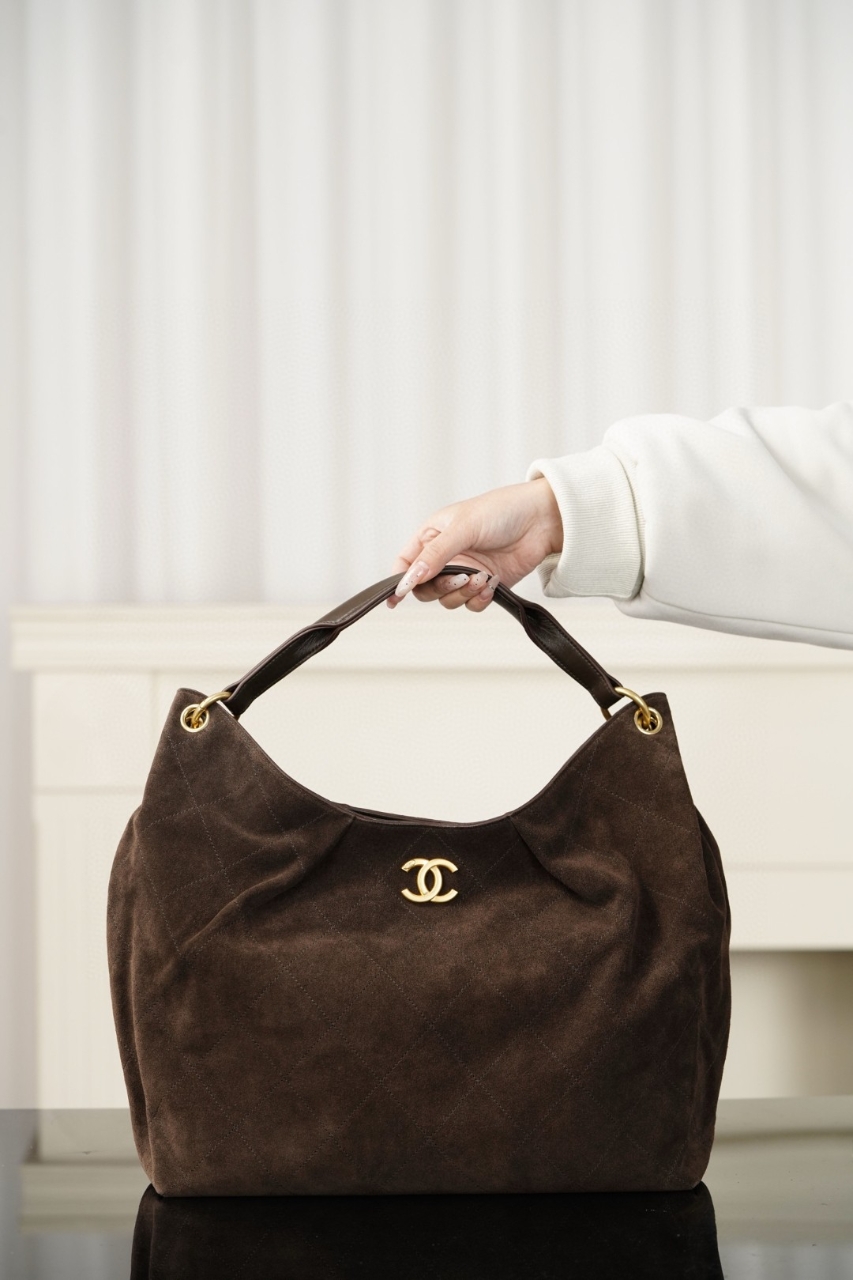 CHANEL 26C 스웨이드 호보 맥시백 브라운샤넬 26C 시즌에서 선보인여유로운 실루엣이 돋보이는 호보 맥시백입니다.부드러운 곡선 라인의 호보 디자인과샤넬 특유의 더블 C 로고 디테일이 조화를 이루어편안하면서도 고급스러운 분위기를 연출하는 모델입니다.고급스러운 프리미엄 스웨이드 소재가 사용되어깊이감 있는 브라운 컬러와 함께우아하고 클래식한 감성을 완성합니다.---DETAIL• 고급 프리미엄 스웨이드 소재• 아이코닉 샤넬 더블C 로고 장식• 자연스럽게 떨어지는 호보 스타일 실루엣• 가죽 핸들 + 체인 숄더 스트랩 구성• 넉넉한 수납이 가능한 맥시 사이즈 디자인• 편안한 데일리 숄더백 스타일---SIZE35 × 38 × 14 cm---STYLE넉넉한 사이즈와 여유로운 실루엣으로데일리백, 출퇴근 가방, 여행용 세컨백까지 활용 가능한 모델입니다.스웨이드 소재 특유의 부드러운 질감과브라운 컬러의 깊이 있는 분위기가 더해져고급스럽고 세련된 스타일을 완성합니다.---