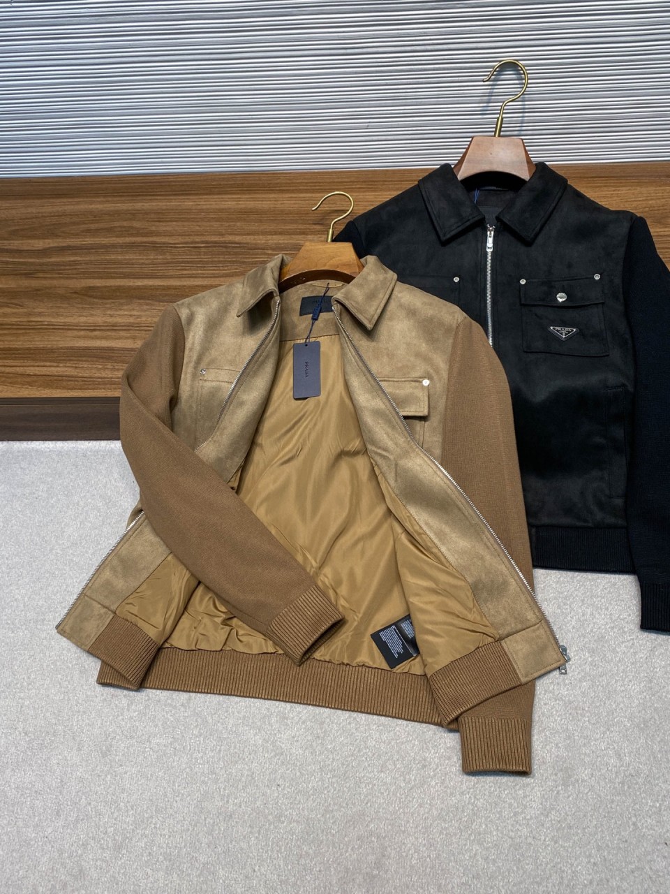 가슴 포켓에 새겨진 삼각 로고 금속 배지가 프라다만의 아이덴티티를 드러내며, 도시적이고 세련된 무드를 완성합니다.