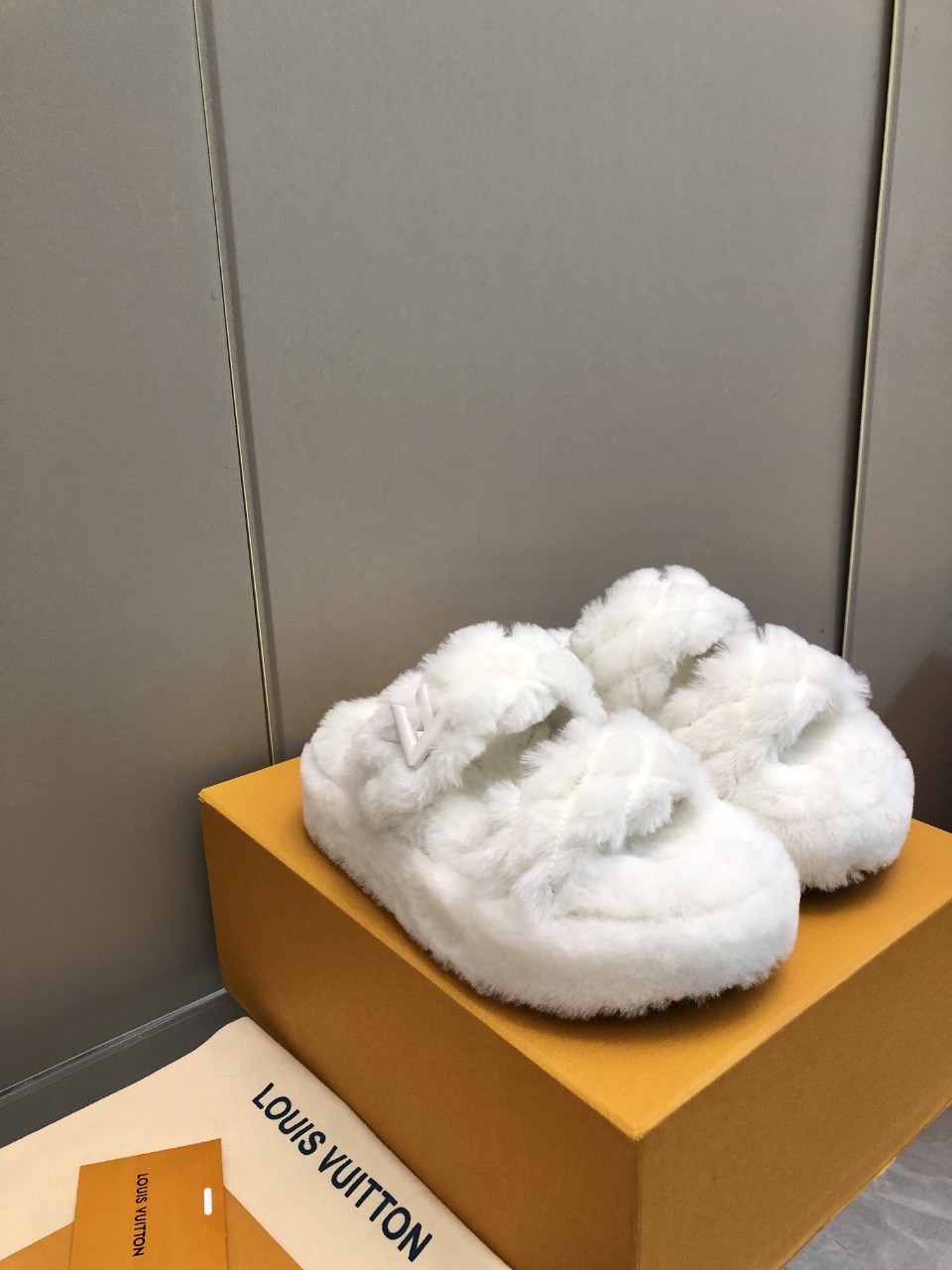 부드럽고 풍성한 화이트 퍼 소재로 완성된 루이비통 겨울 시즌 한정 컬렉션. LV 로고 자수가 돋보이는 따뜻한 실내·외 겸용 퍼 슬리퍼입니다.