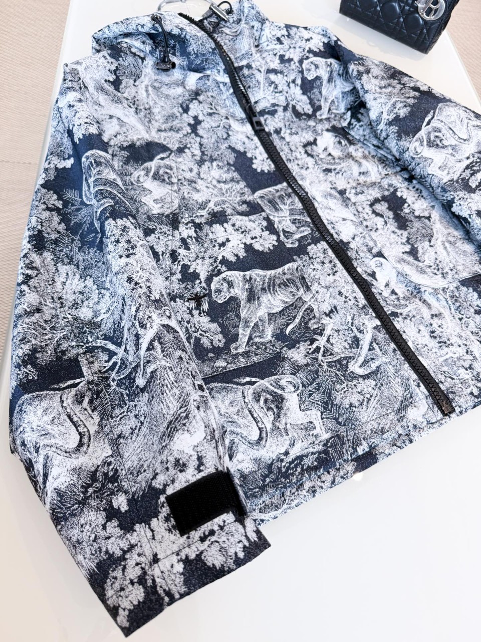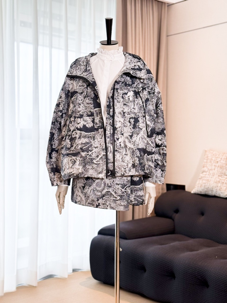 디올의 아이코닉한 뜨왈 드 주이(Toile de Jouy) 플라워 프린트가 돋보이는 후드 코트입니다.