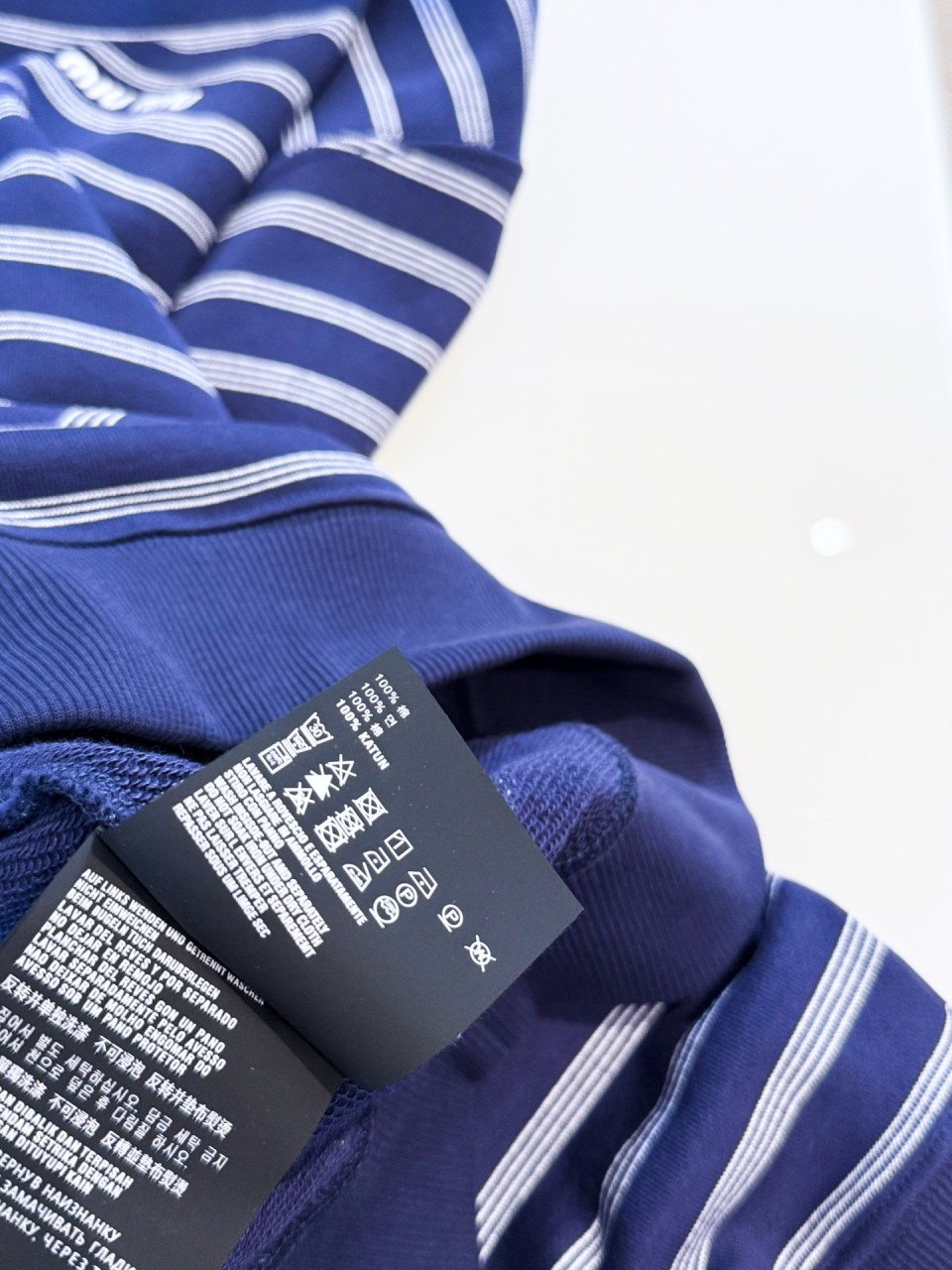 클래식한 블루-화이트 스트라이프 패턴과 반집업 디테일이 더해진