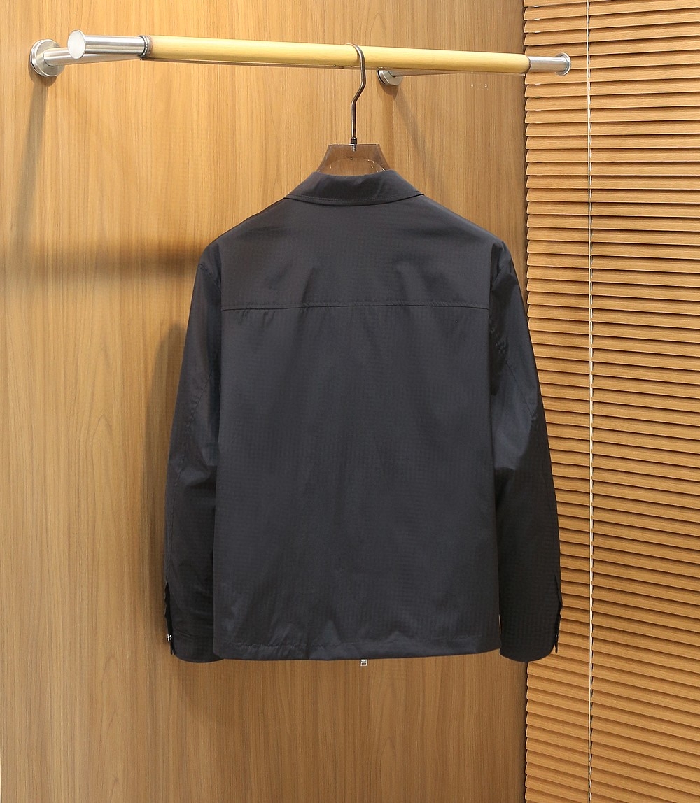 프라다 시그니처 리나일론 원단으로 가볍고 탄탄한 내구성, 고급스러운 광택감이 특징. 미니멀한 디자인에 트라이앵글 로고 디테일로 브랜드 아이덴티티 완성. 깔끔한 카라형 집업 스타일로 포멀과 캐주얼을 모두 아우르는 활용도 높은 아우터.