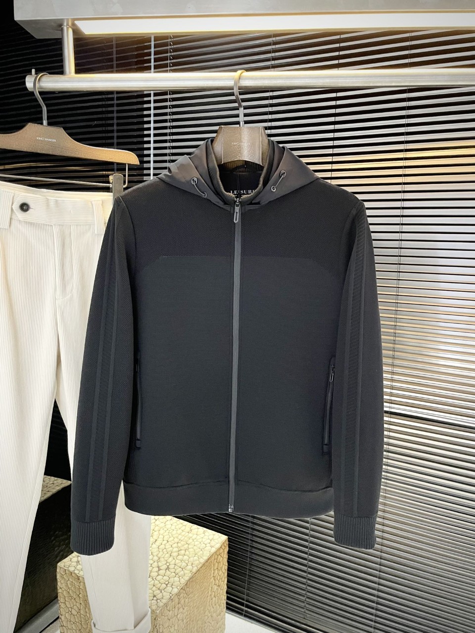 . 앞 지퍼 클로징과 후드 스트링 디테일로 실용성과 세련미 동시 만족