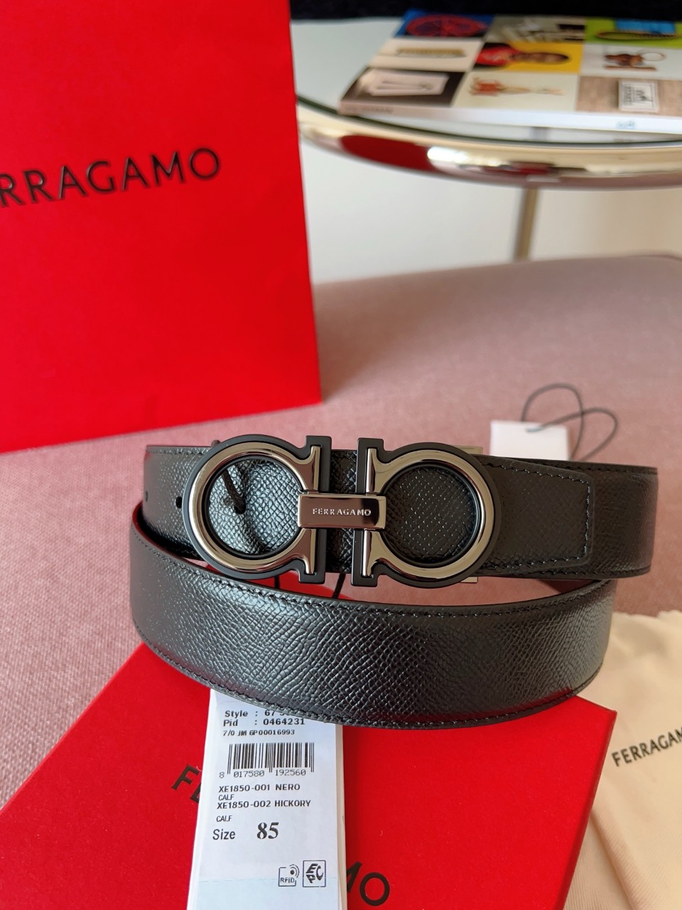 페라가모의 상징인 간치니 버클이 돋보이는 고급 가죽 벨트.