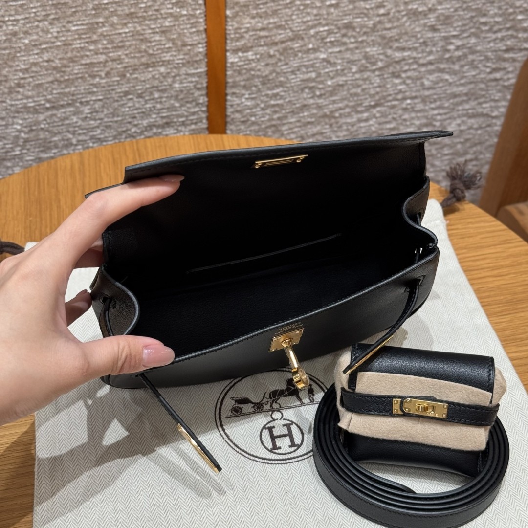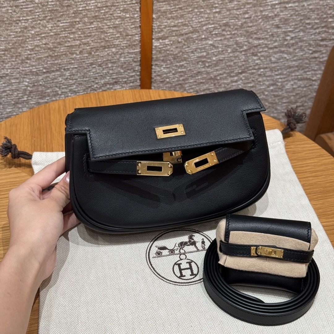 Hermès의 아이코닉한 Kelly 라인의 미니 파우치 스타일 고급스러운 블랙 컬러 + 골드 하드웨어 조합 → 시크하고 클래식한 무드