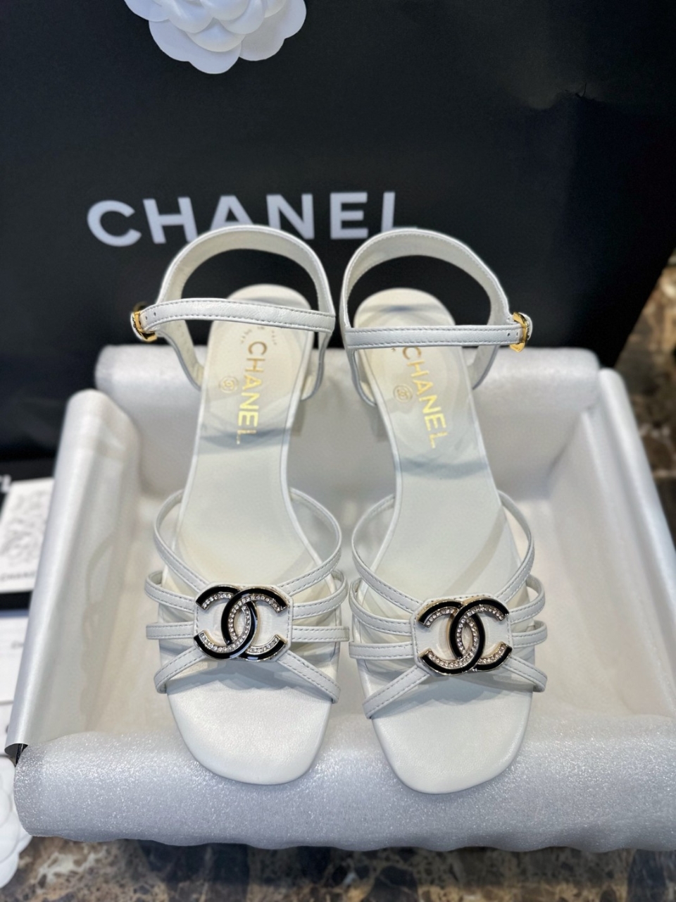 세련된 CC 로고 장식과 은은하게 반짝이는 크리스탈 디테일이 돋보이는 샤넬 25P 시즌 힐 샌들입니다. 우아한 화이트 컬러와 여성스러운 스트랩 디자인으로 데일리룩부터 모임·휴양지 스타일까지 고급스럽게 스타일링하기 좋은 모델입니다.