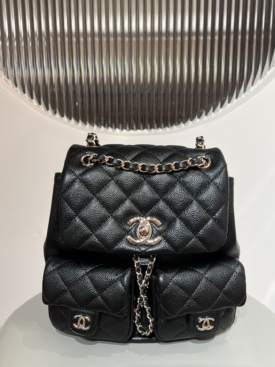 샤넬 백팩 라인 중 아이코닉한 듀마(Duma) 모델로, 클래식 퀼팅 패턴과 체인 & 가죽 믹스 스트랩이 특징입니다. 캐비어 가죽 특유의 단정한 질감과 구조적인 실루엣으로 데일리부터 포멀까지 폭넓게 활용 가능한 디자인입니다.