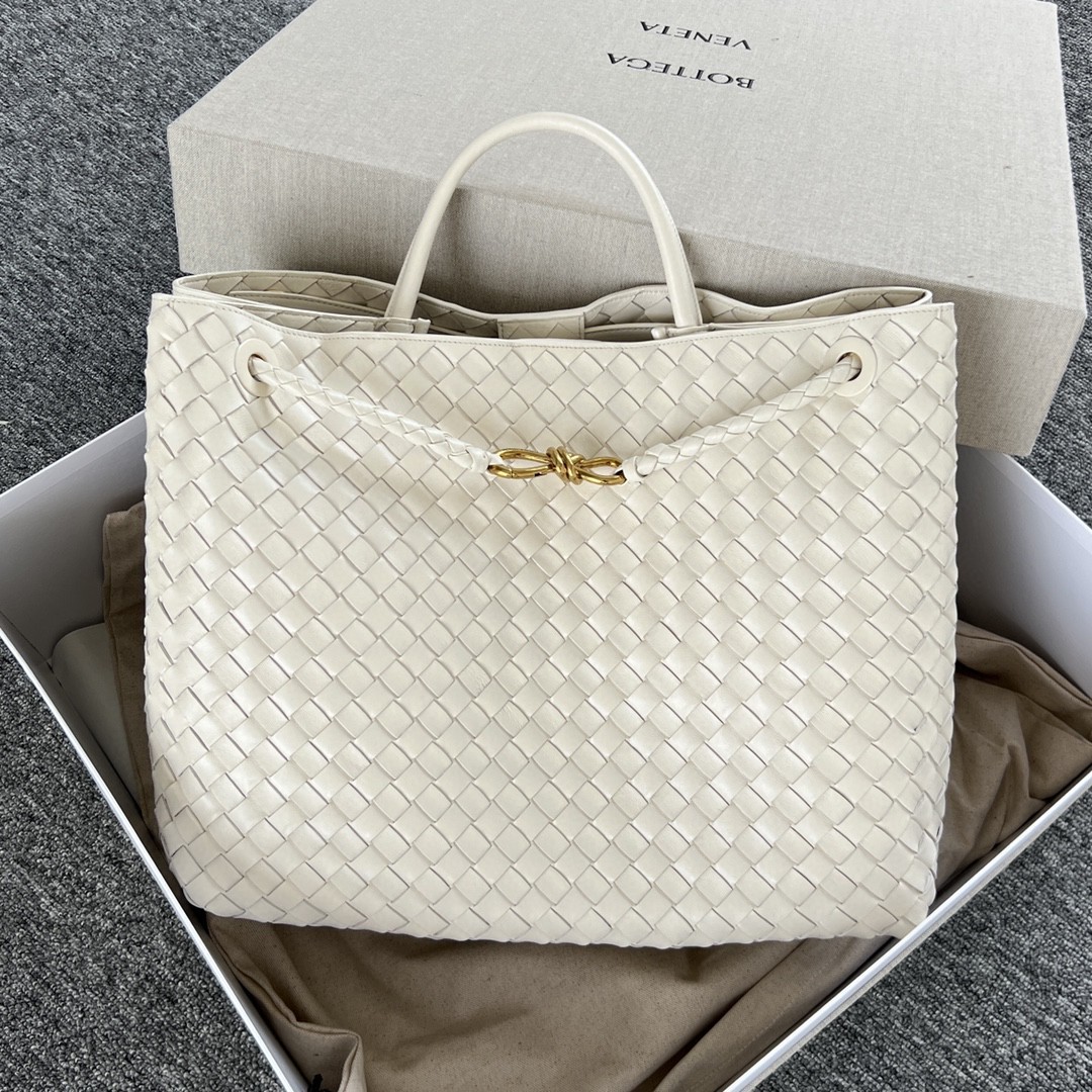 보테가의 시그니처 인트레치아토 위빙과 골드 매듭 디테일이 특징인 안디아모 라인 토트백입니다. 부드러운 Nappa 양가죽으로 제작되어 화이트 컬러 특유의 고급스러움과 세련되며 깨끗한 분위기를 연출합니다.