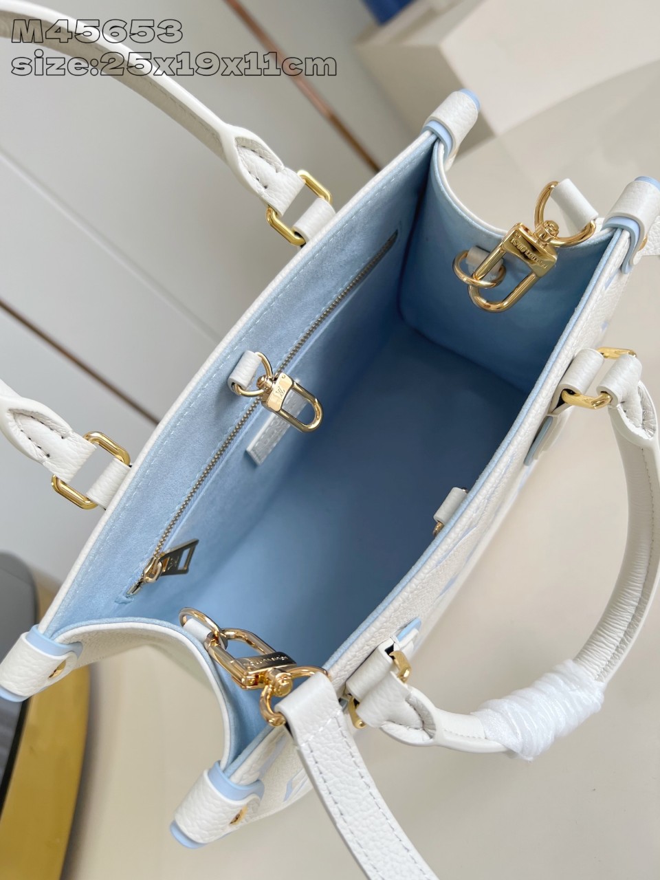 부드러운 모노그램 앙프렝뜨 가죽 위에 화이트&블루 실크스크린 프린트가 더해져