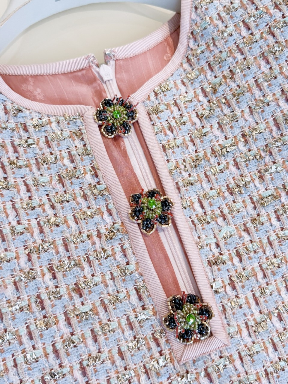 핑크톤 트위드에 스팽글 자수가 은은한 반짝임을 더해주며, 고급스럽고 로맨틱한 무드를 연출합니다.
