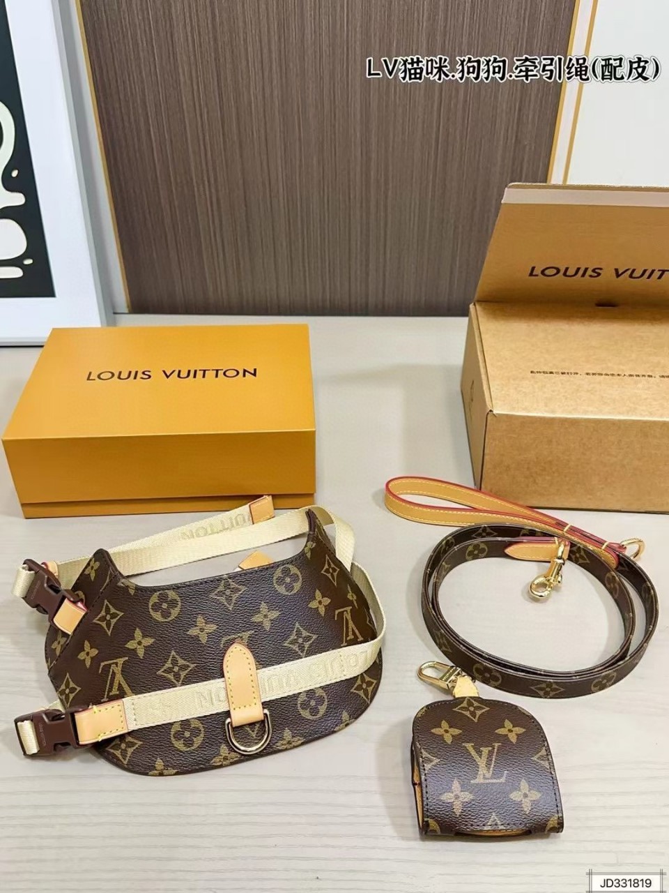 Louis Vuitton 루이비통 반려견 하네스 + 리드줄 + 미니 파우치 세트 (선물박..